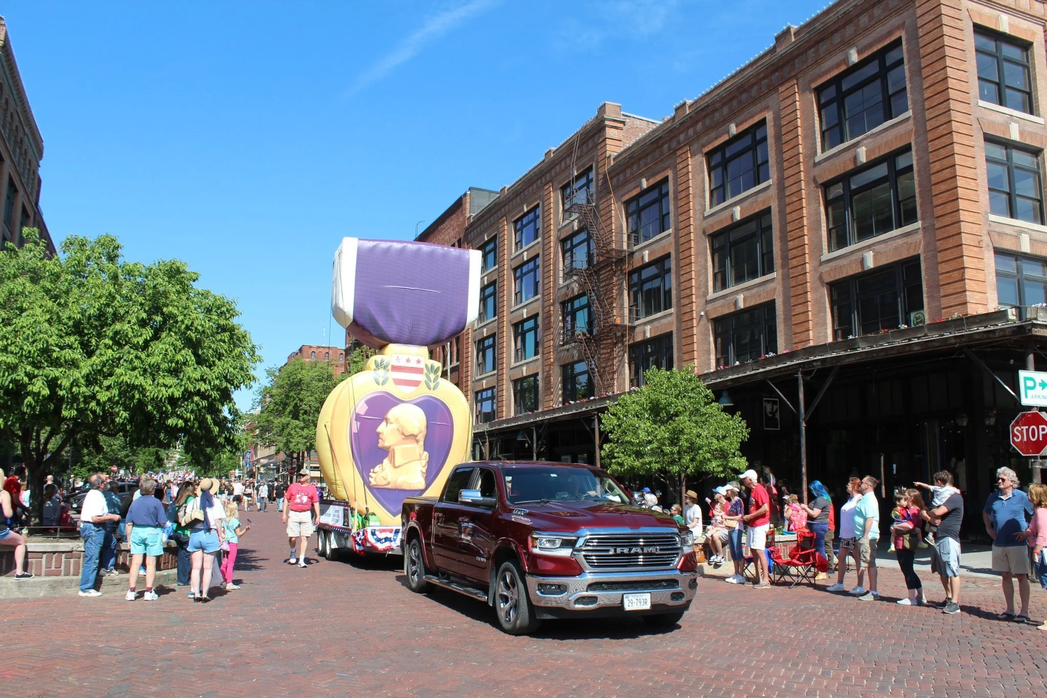 The Purple Heart inflatable balloon is a wonderful patriotic addition to any parade or event. It is 22 feet high and uses cold air, not helium.